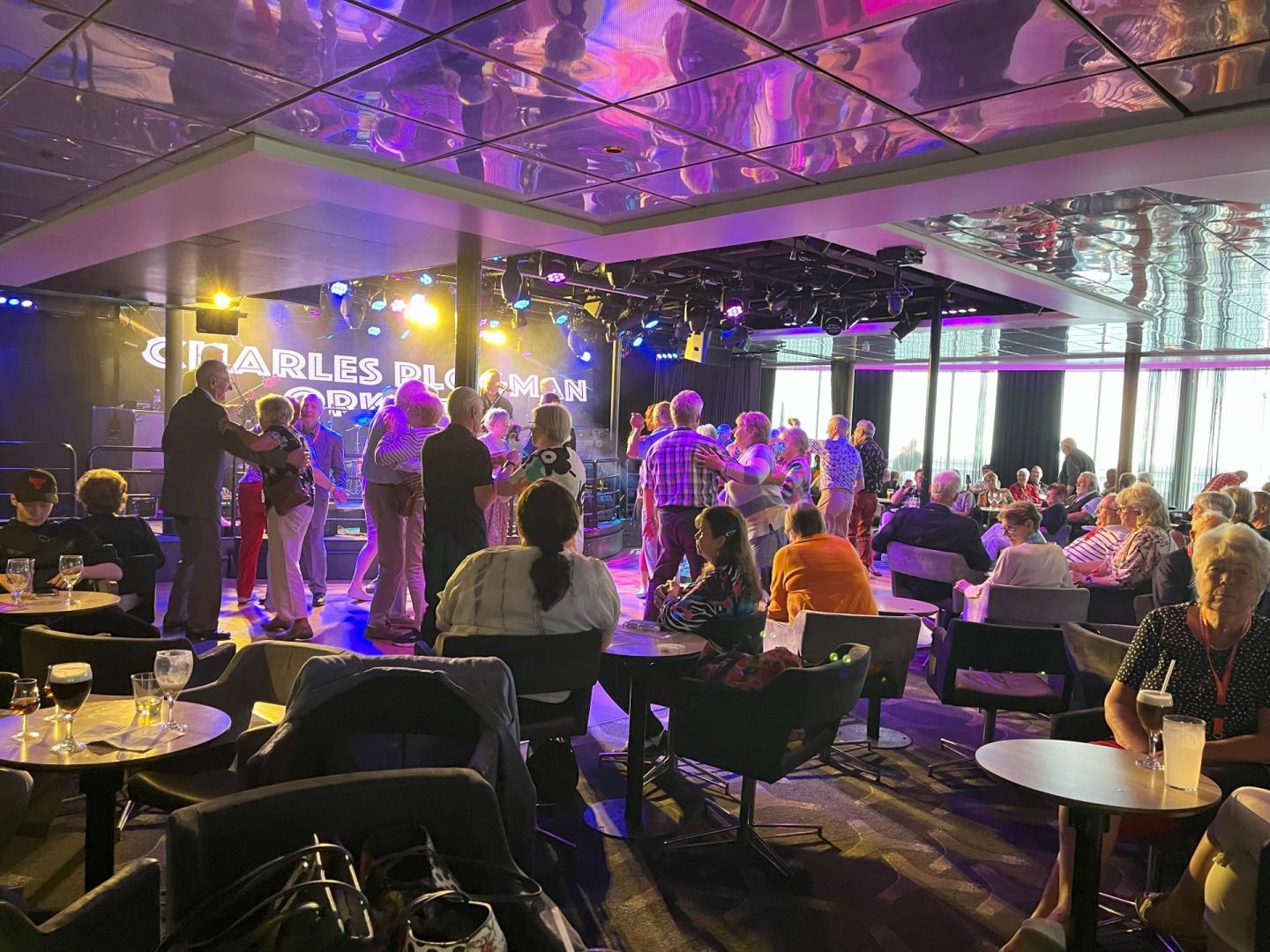 Gansdka snabbt efter ombordstigningen var det dags för dagens första buffe, som avnjöts i trevligt sällskap. Efter Buffen kunde resenärerna dansa till Charles Plogmans orkester som spelade svenska låtar i Club-X.